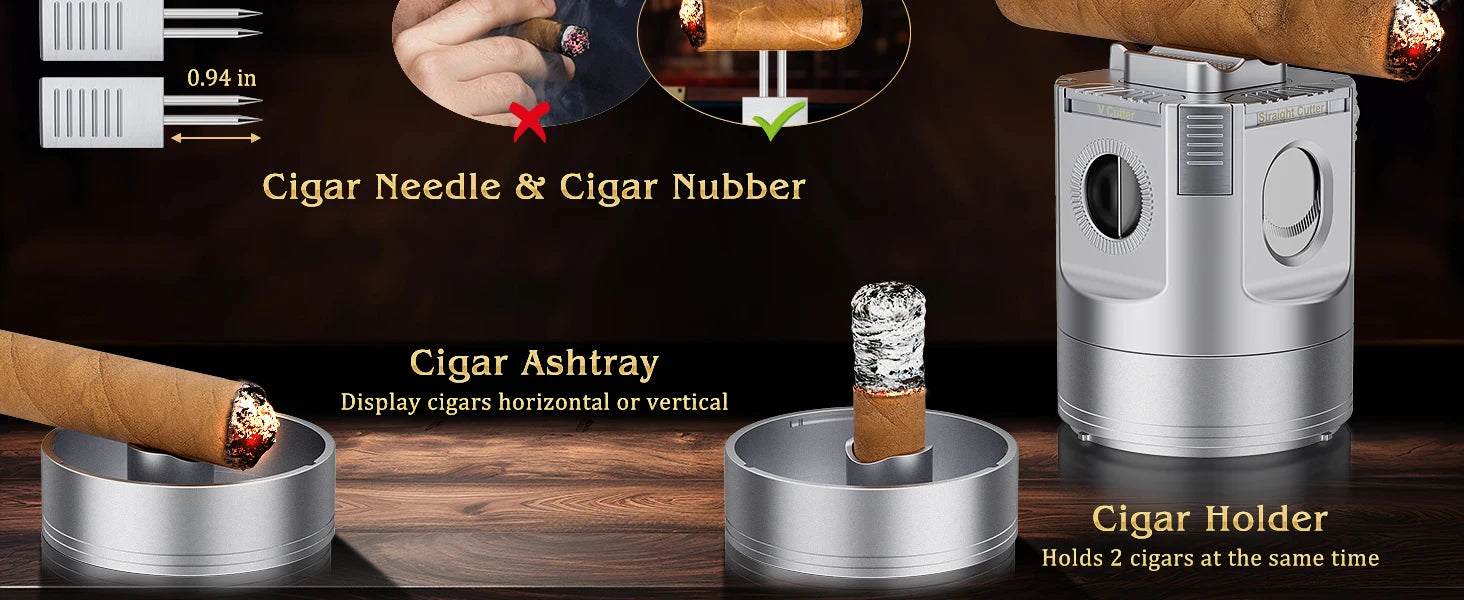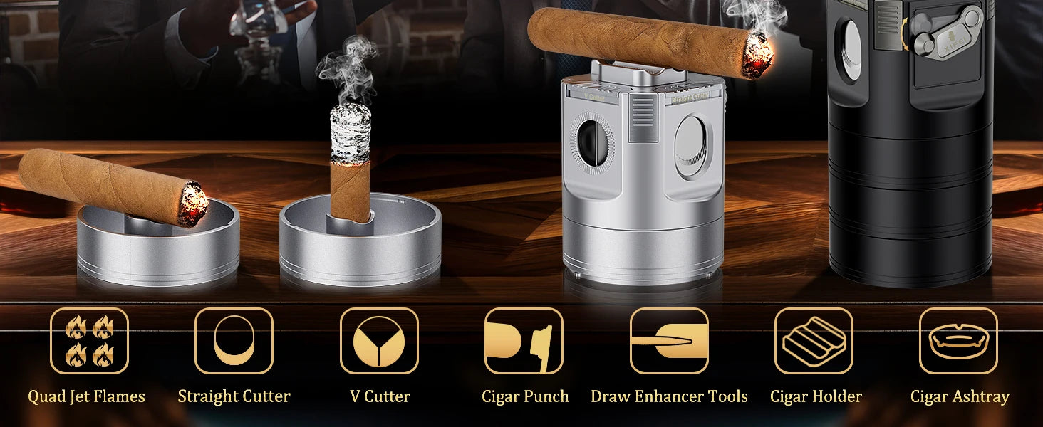 Features: dual cigar puncher / 5 cigar holders / 3 cigar needles / 3 cigar ashtrays / Windproof / V cutter / straight cutter / Cigar Punch / 4 Jet windproof torch lighter / 3.35"W x 5.93" / Metal / Gift Box