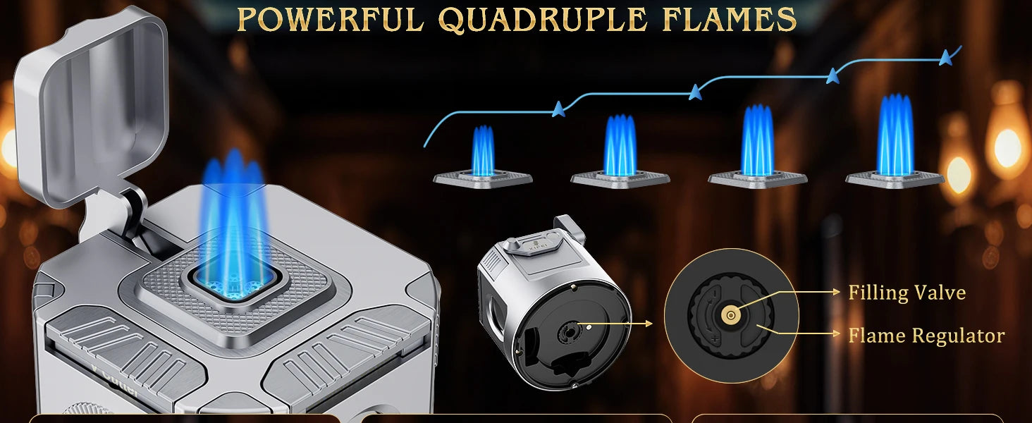 At its core, this is a powerful lighter with a retro rocker ignition button that fires up four jet torch flames for a quick and even light every time. The flame intensity can be easily adjusted with the large valve on the bottom. When you're not using the lighter, the safety cover's two built-in grooves double as a cigar holder, so you can rest your cigar without it rolling away.