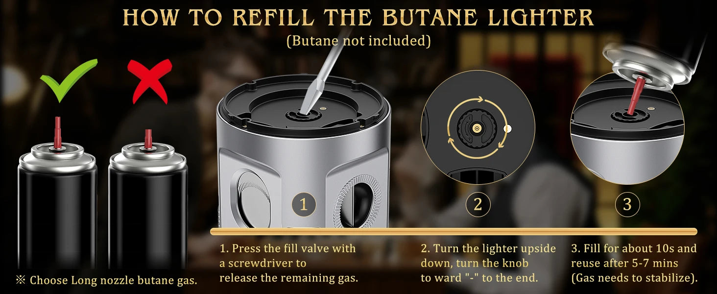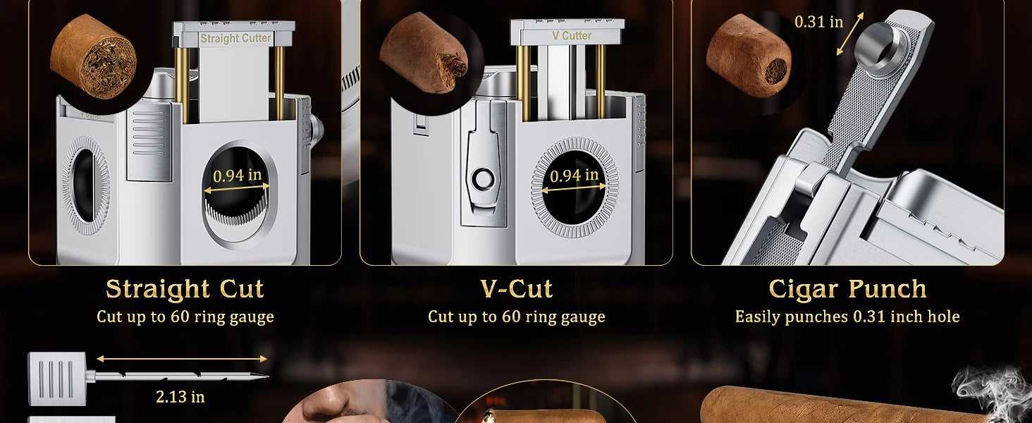Beyond the flame, the set includes a full suite of accessories for the perfect cut and draw. It comes equipped with a sharp V-cutter and a straight cutter for a clean, precise cut. A built-in cigar punch and a cigar draw enhancer help you fix a tight draw or blockage. Plus, two extra cigar needles offer a secure grip to prevent burnt fingers.