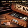- Inside, the humidor features a 5-layer storage design with four spacious, hollow-carved cedar trays. It can hold 100-150 cigars and includes a dedicated bottom drawer with a foldable handle for all your accessories, like lighters and cutters. The entire interior is crafted from natural cedar wood, which provides excellent moisture retention and a rich, aromatic environment to enhance the flavor of your cigars. This all-wood construction ensures your collection remains fresh and flavorful, adding a touch of natural charm to your space.