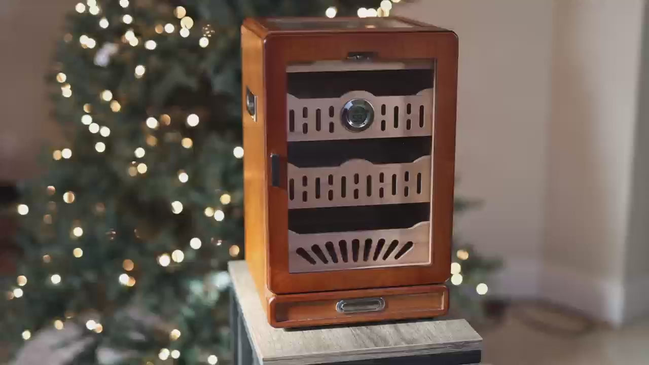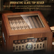 - This elegant cigar cabinet is the perfect way to display and preserve your collection. Featuring a tempered glass top and door, it allows you to admire your cigars at a glance without ever opening the cabinet, combining a luxurious showcase with practical functionality.