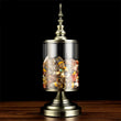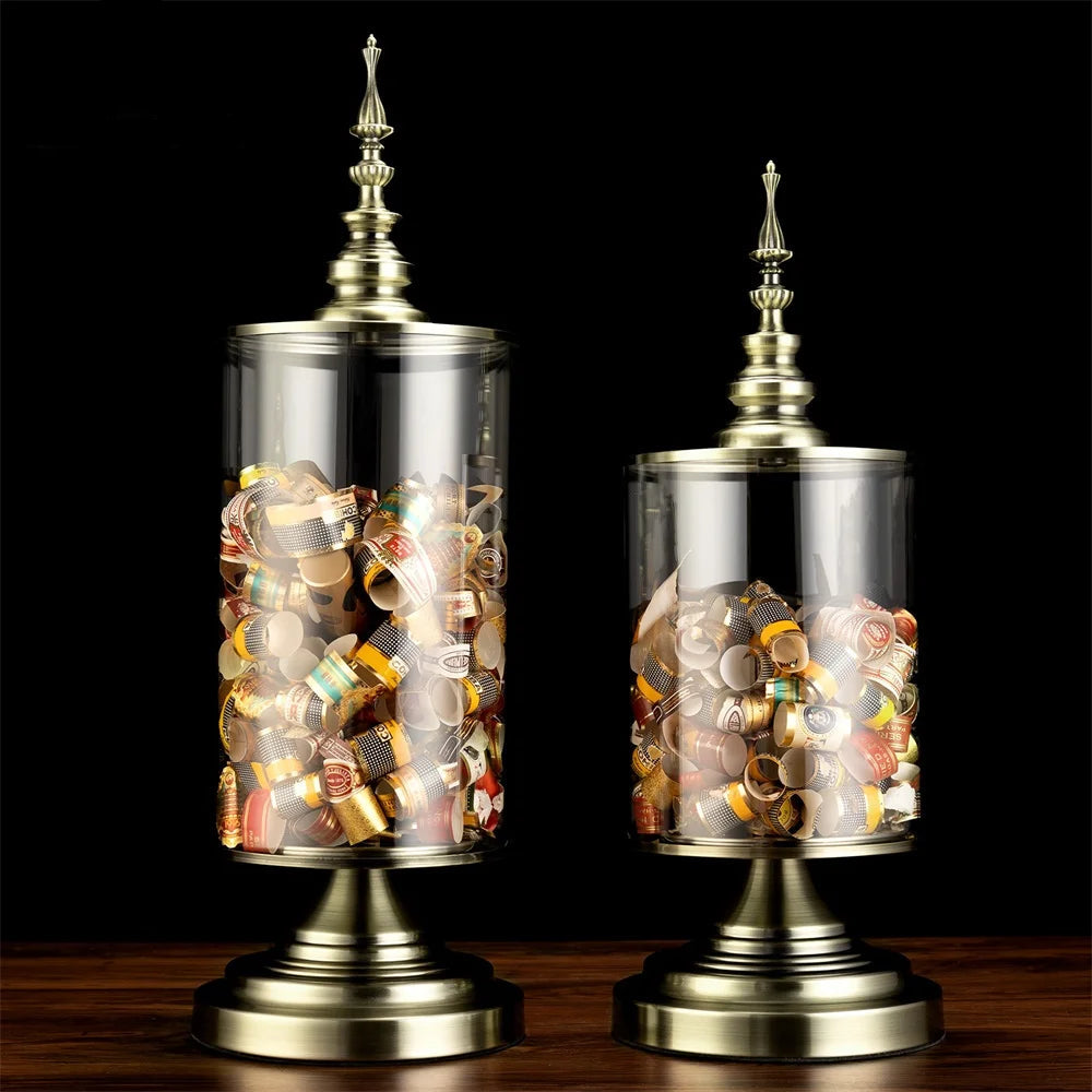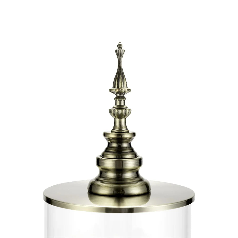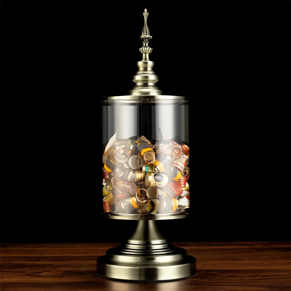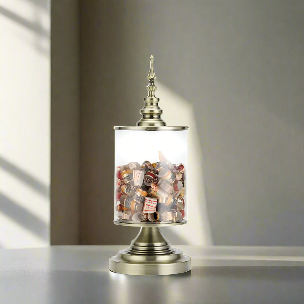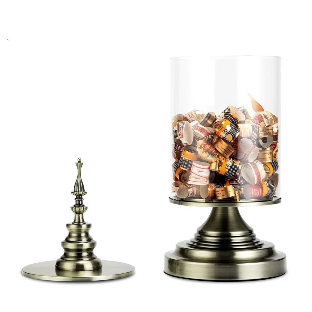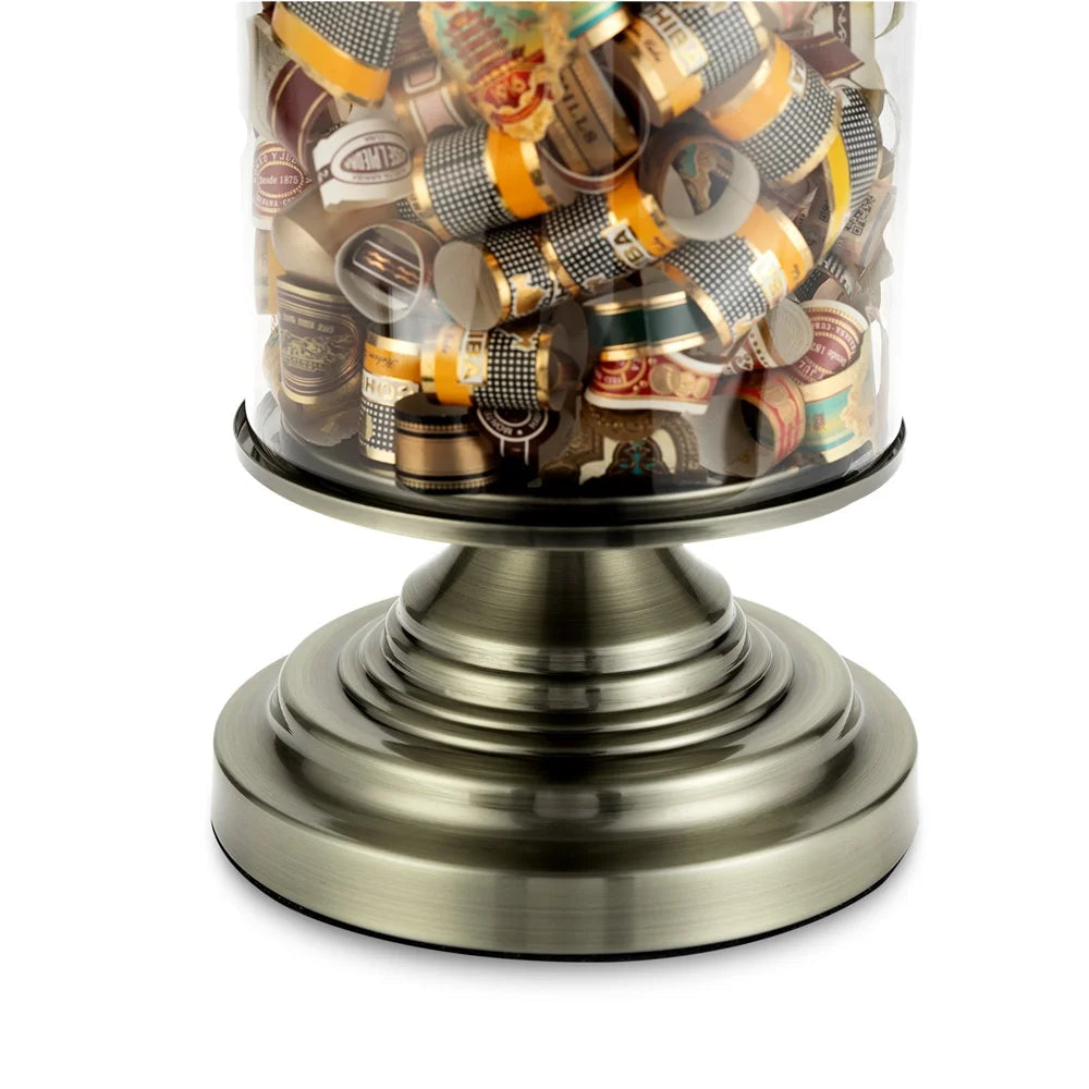 Celebrate your journey as an aficionado with this elegant cigar band collection jar. Crafted with a premium crystal glass cylinder and a distinguished antique-finished metal base and finial, this piece transforms your cherished cigar bands into a timeless display. It's more than just a container; it's a sophisticated keepsake that beautifully honors every cigar you've enjoyed.