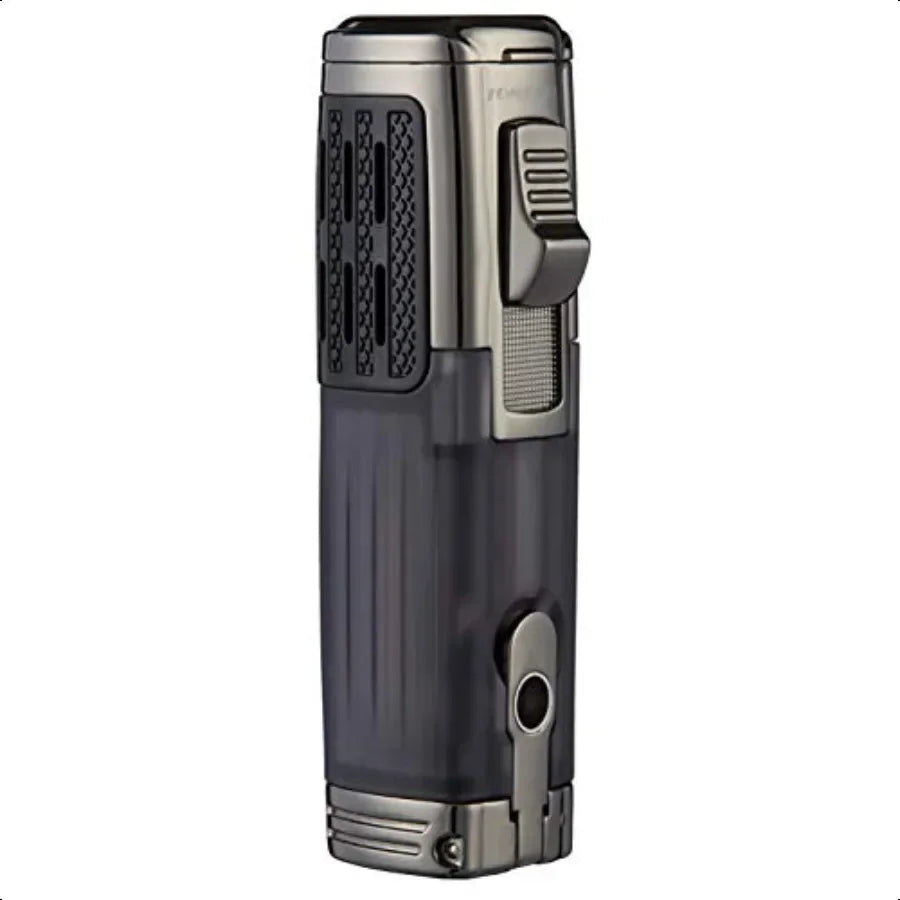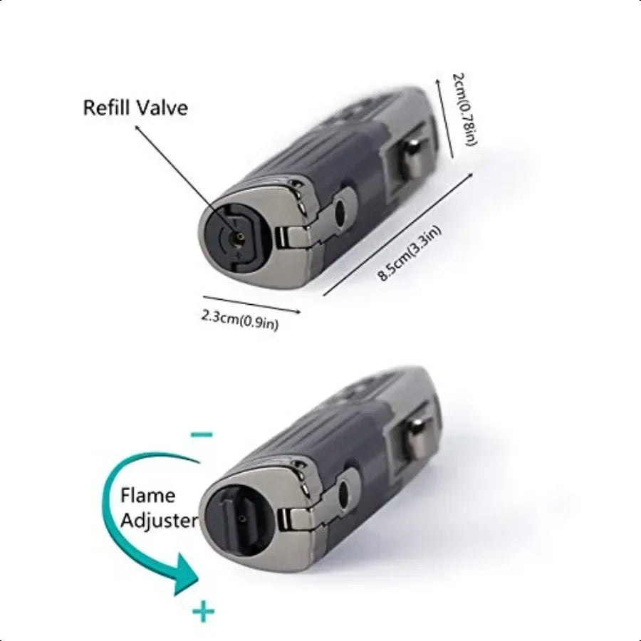 This set of two cigar lighters is a perfect blend of style and function. Each lighter features a durable zinc alloy top and a high-quality ABS plastic body with a sleek, textured finish. The powerful triple torch flame provides a reliable, wind-resistant ignition for cigars, while the innovative transparent fuel tank lets you easily monitor the butane level. Versatile enough for many uses and presented in an exquisite gift box, this 2-pack makes an ideal gift for any occasion. Also includes a cigar punch at the bottom of the lighter