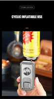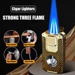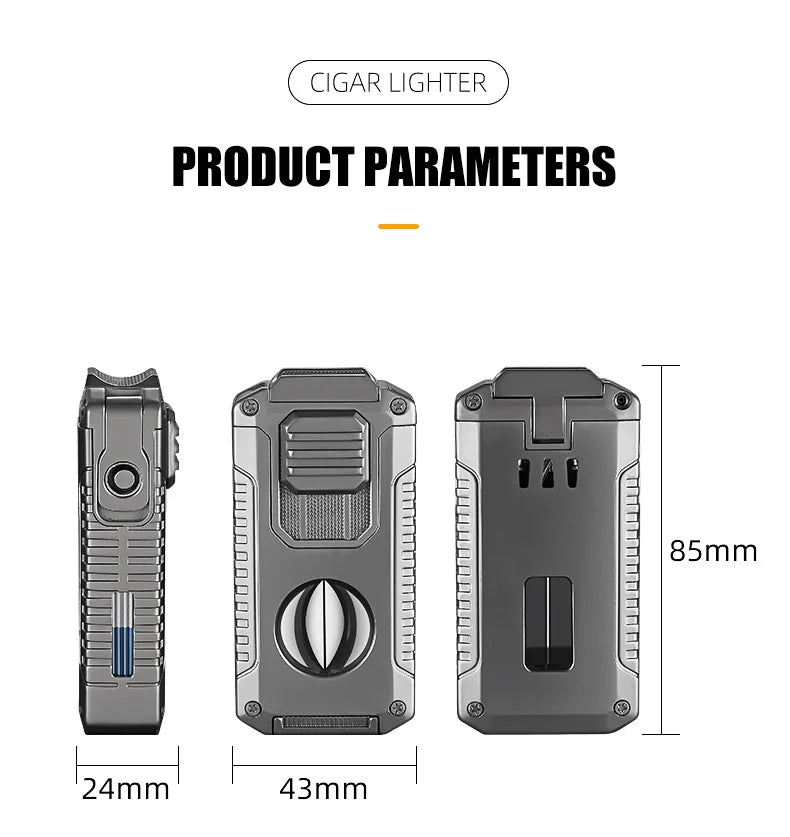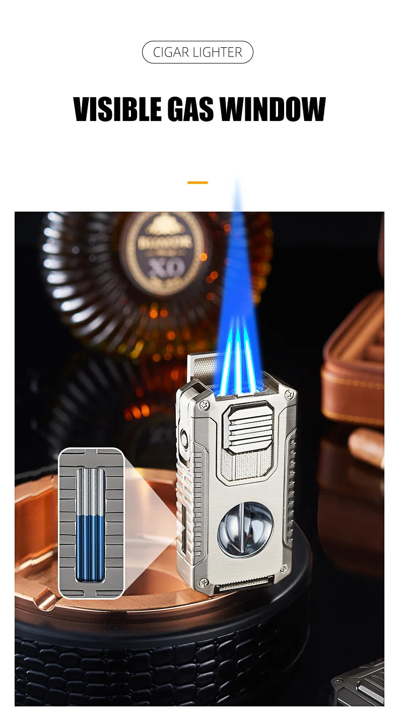 This high-quality butane torch lighter is designed for the discerning individual, combining triple windproof flames with a suite of essential tools. It features a V-shaped cutter, a punch, a draw enhancer, and a holder for small items. This all-in-one design makes it incredibly portable and practical, perfect for business or outdoor travel, and a luxurious addition to your daily essentials.