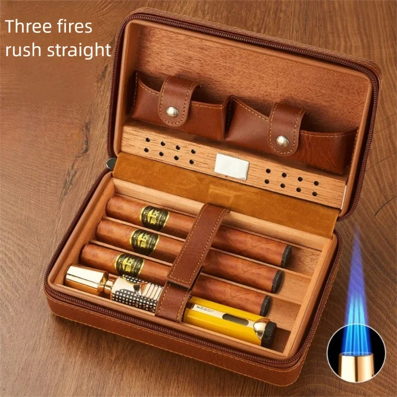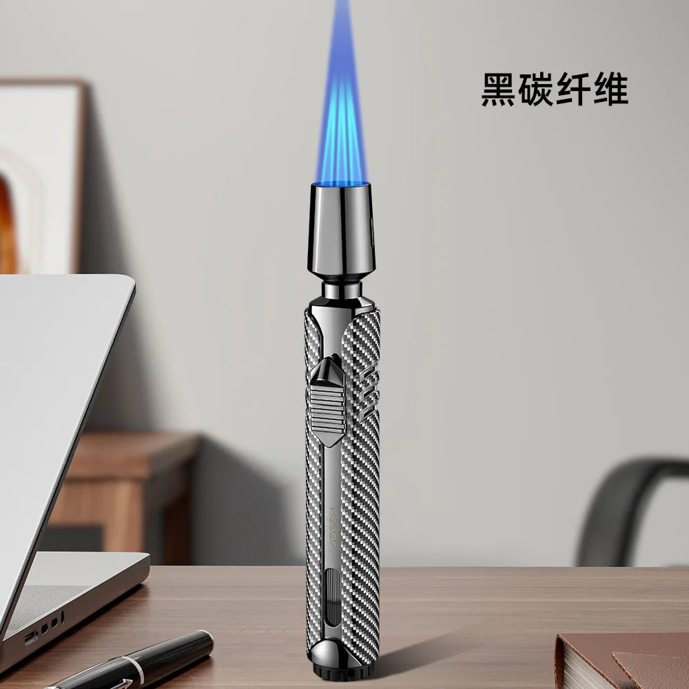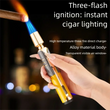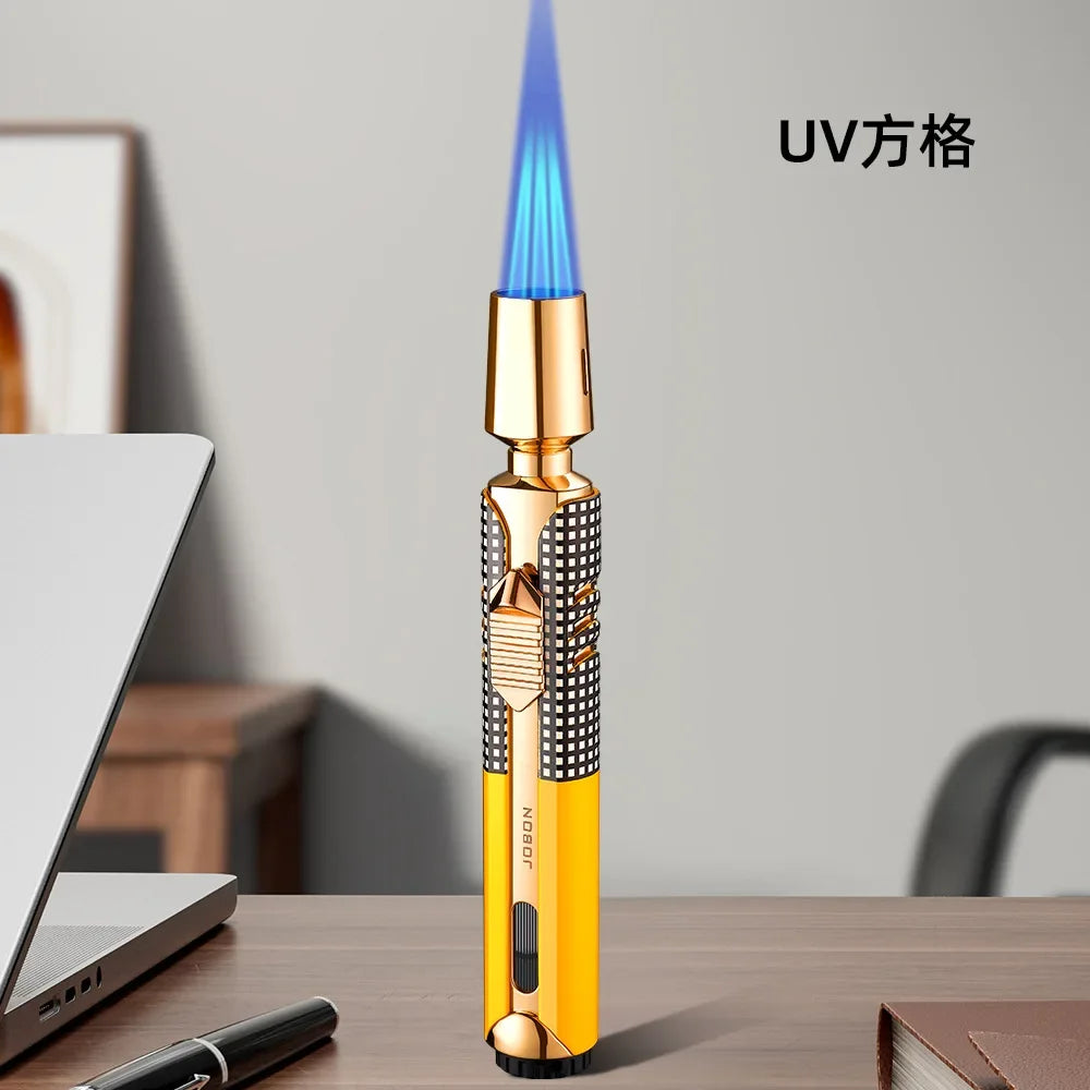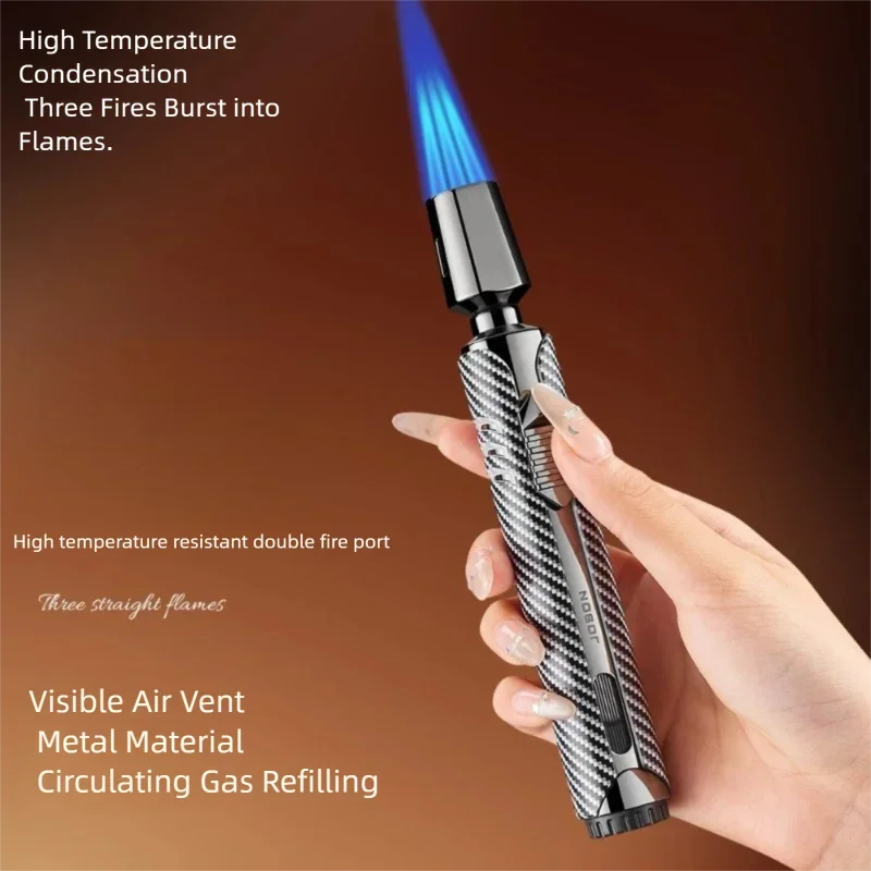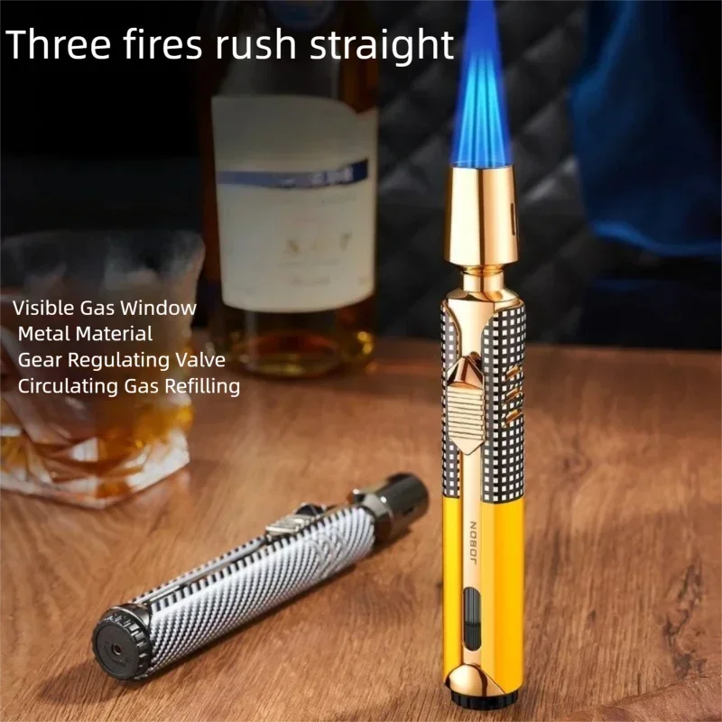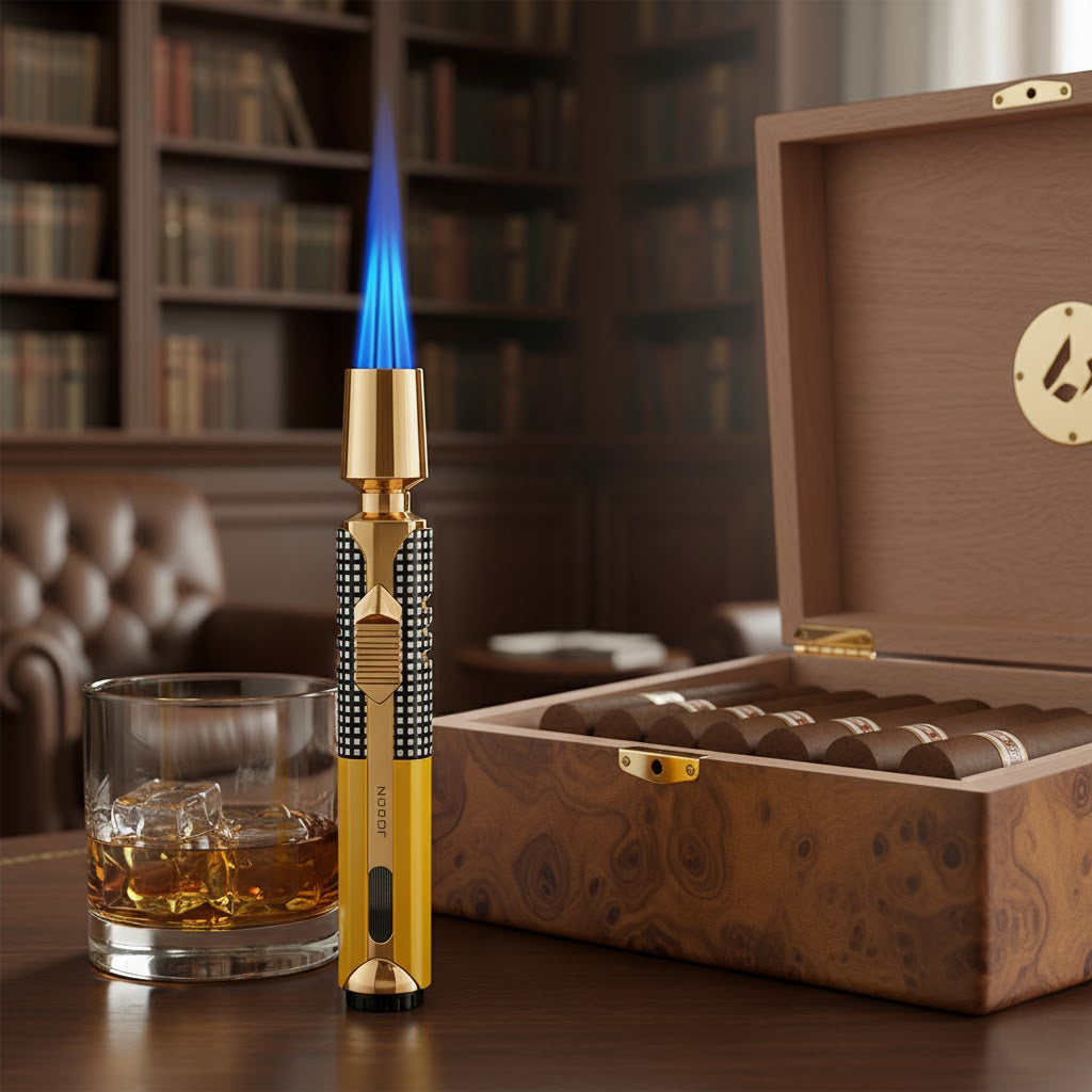 This stunning triple-flame torch lighter combines a luxurious gold-finished alloy body with a distinctive cube (Cohiba) pattern for a high-end look. Expertly shaped like a cigar, it is designed to fit seamlessly into your travel humidor or any standard cigar pouch, ensuring you're prepared wherever you go. It delivers three powerful, windproof blue jet flames for precise and rapid cigar ignition, while a visible fuel window ensures you always know when to refill. A perfect blend of style and utility, this portable accessory makes an exceptional gift for any discerning smoker.